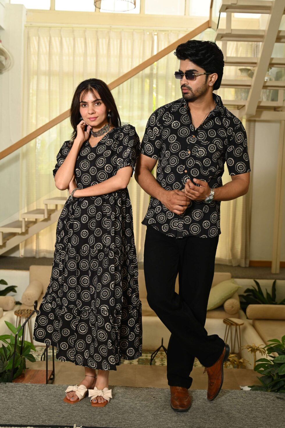 This Black Printed couple matching outfit includes a women?s flowy cotton midi dress and a men?s short-sleeve printed shirt. Designed with cheerful floral prints, this set is perfect for summer outings, casual gatherings, or twinning on vacations.